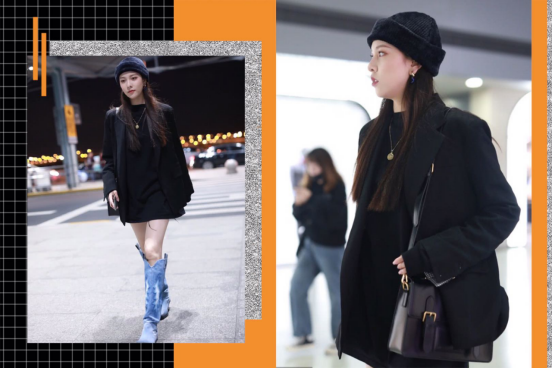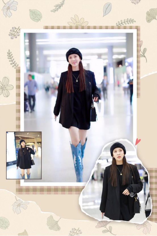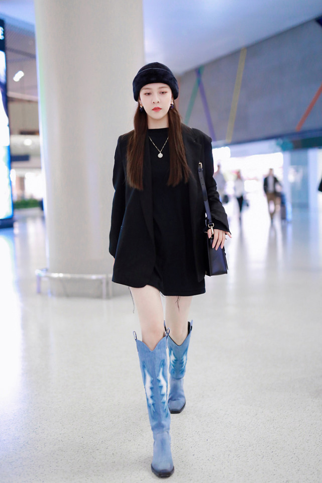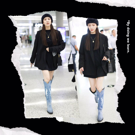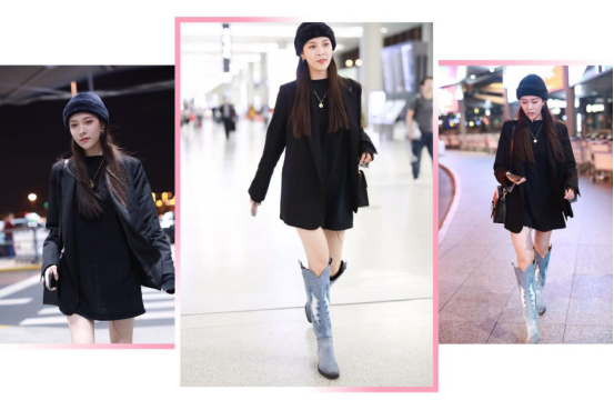 LOOK4 优雅霸气风宋妍霏现身机场。只见她身穿一袭黑色连衣裙配蓝色牛仔靴,气质很高贵,这条小黑裙设计很精致,上半身是圆领的设计,地露出了宋妍霏那漂亮的天鹅颈