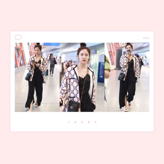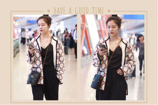 宋妍霏运用低领的黑色吊带搭配黑色的开叉阔腿裤不费力就穿出时尚又新颖的look。这身搭配中的老花夹克,更是省心的单品,不费力就穿出复古文艺范