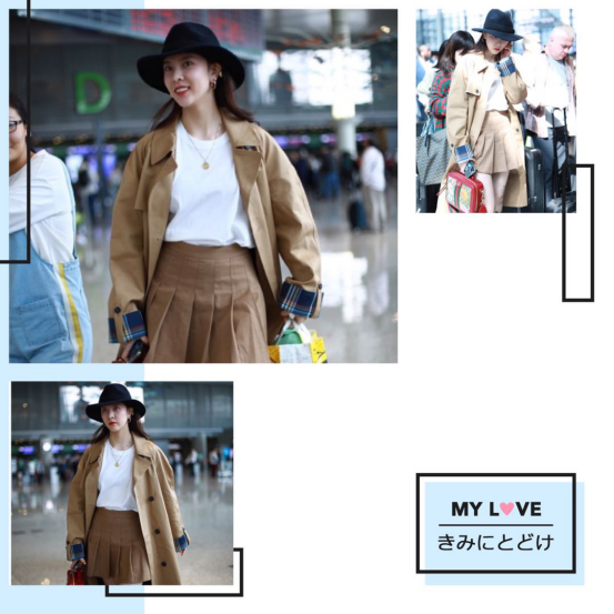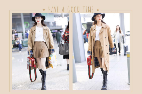 LOOK1 复古英伦风宋妍霏以清新脱俗的形象新颖了很多观众的喜爱,加上帅气的外表搭配任何服装都十分的时尚。宋妍霏身穿卡其色风衣搭配同色系百褶裙现身机场,整体看起来十分潇洒脱俗