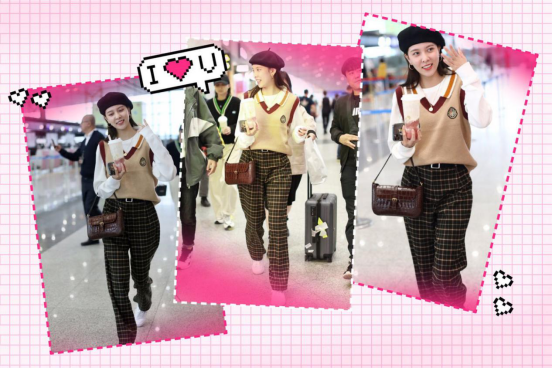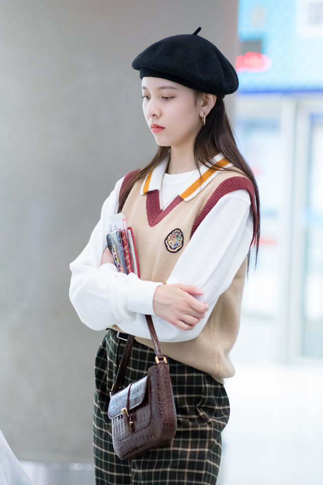 这次现身机场的宋妍霏身穿一件哈利波特针织背心内搭一件白色T恤。下身搭配一件黑色格纹裤,满满的英伦风。针织背心采用卡其色为主打色