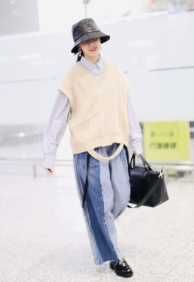 宋妍霏现身机场时,身穿条纹衬衣搭配织花背心,下身搭配阔腿裤就的好。针织背心有点破洞的感觉,更具有个性感和时尚感。而阔腿裤是深色与浅色拼接的设计