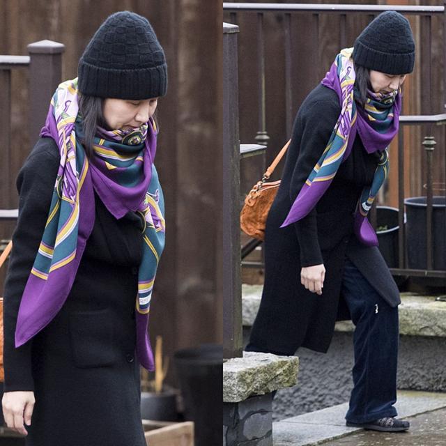 若是在秋冬季节,可以搭配纯色系中长款大衣,像孟晚舟身穿的黑色大衣,单从服装单品上看其实挺暴露减龄的,但好在充分利用了丝巾,无论是把它当作围巾或披肩,都能减轻造型沉重感,展现女性的优雅。