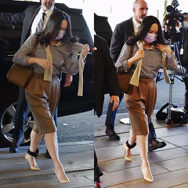 衬衣是很多中年女性都会选择的单品,尤其是职场女性,衬衣的搭配能让整体造型看起来时尚而不乏正式感。但蓝白条纹的衬衣很容易撞衫,所以在搭配上就得加一些有辨识度的细节设计,像孟晚舟就聪明地搭配了一件针织衫披肩,这样既能修饰略显丰腴的身材,同时也丰富了整体造型。