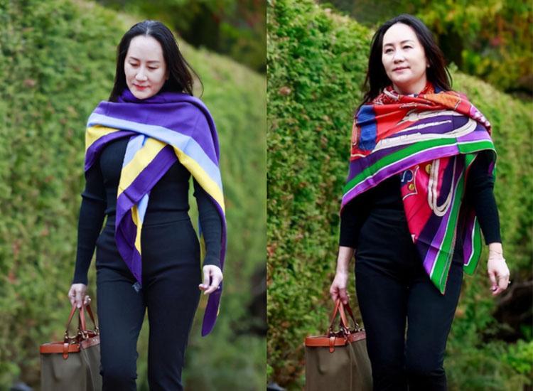 像孟晚舟“把丝巾当作披肩”的搭配方法,一下就让整体造型变得高级起来,并且还提升了个人气质。多种颜色拼接而成的丝巾,首先在视觉上就起到了提亮果,搭配极具异域风情的印花元素装饰,瞬间省略了其它服装的搭配,即便穿得简单看起来也不普通。