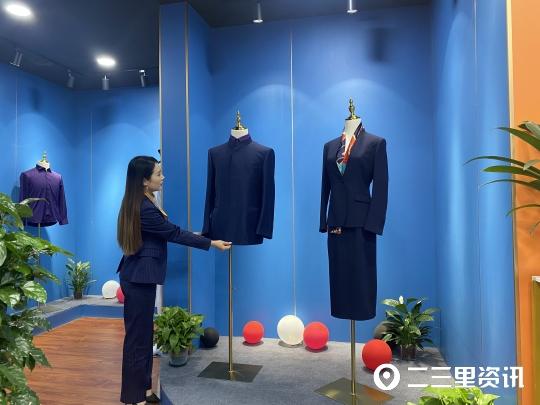 送走客户,杨琳带着记者来到公司二楼,暖调的装修风格,宽敞明亮的大开间摆放着人形西装模特,藏青色、黑色、红色的服装,地贴合着模特的身形。