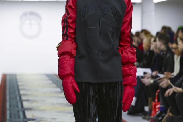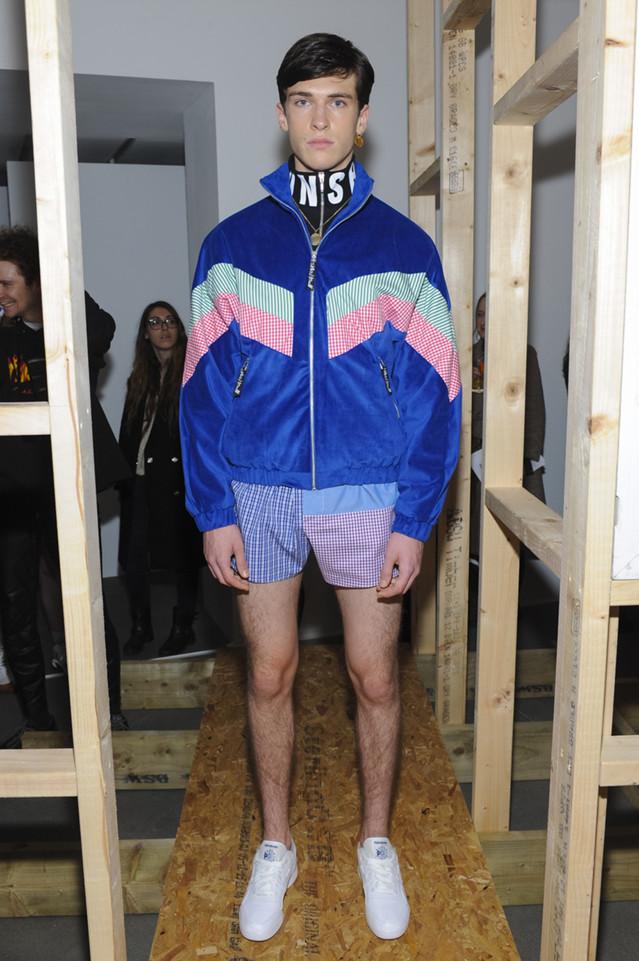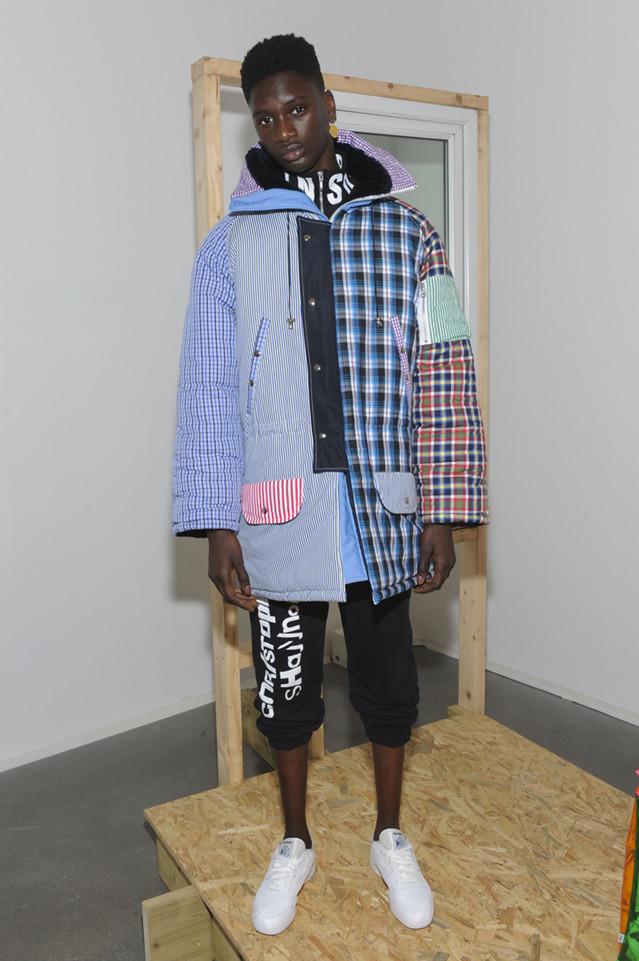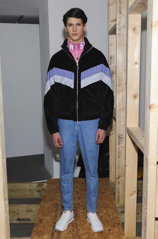 谈回衣服本身,虽然不如像往季一样地夺人耳目,但也不算寡而无味。格纹拼贴的上衣和荧光透明塑料夹克中依然能洞悉Shannon独特的童心。高领拉链外套已经是当下设计师描述八九十年代街头的固定桥段,但设计师挑选的颜色搭配和面料还算不过不失,可惜的是他那件做了好几季的毛衣没有坚持下来。