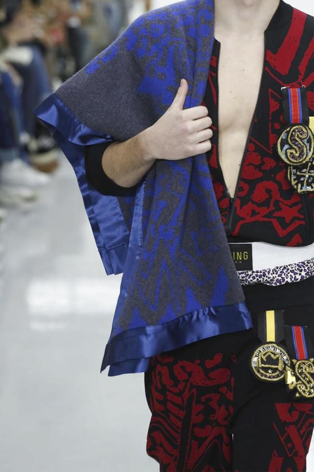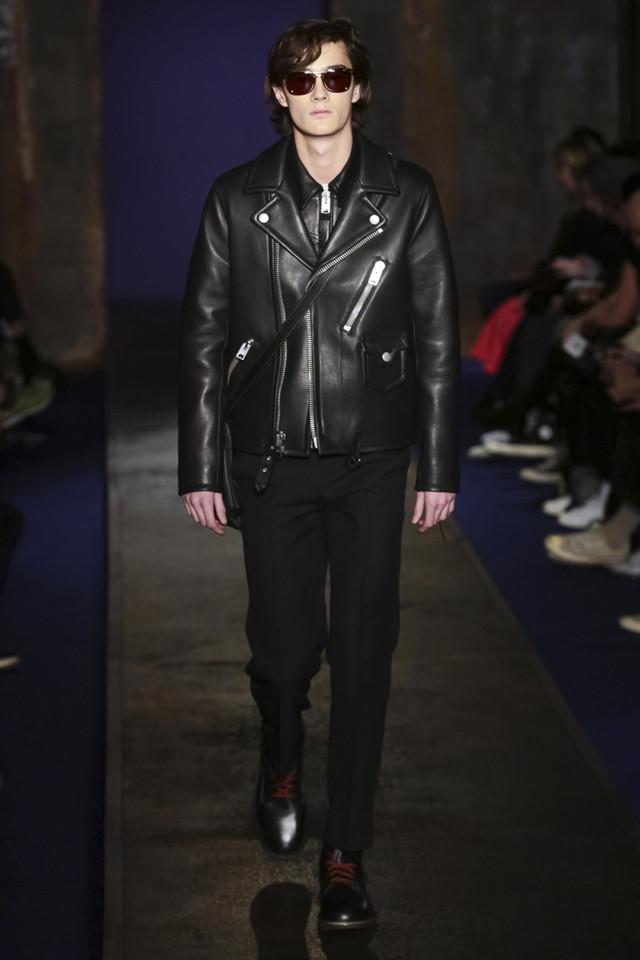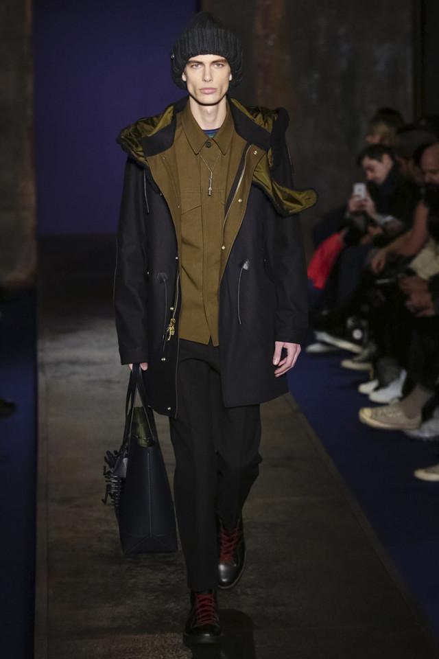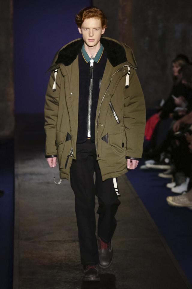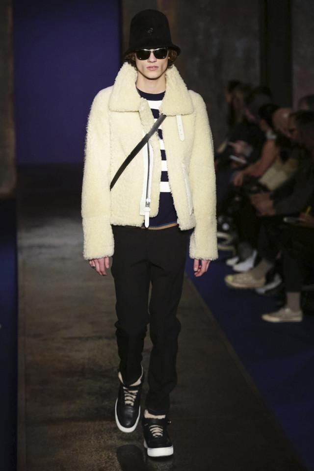 本季Coach将其男装高级成衣系列命名为Coach 1941,顾名思义地设计师将这个系列的时间点定在了40年代的美国 。他以一个回顾的视角来观察美国乐观主义的精髓, 找寻美国梦初始里的少许反叛。摩登的东岸蓝领雄性味道混和早期纽约嘻哈文化,与品牌的女装一样,设计师巧妙地在斜挎包和卡通飞机、恐龙骨架钥匙扣等标签化元素上留下线索。亮皮夹克和浮夸皮草里所浸透的Low-Fi奢华感,与代表了这个时空里美国中产阶层的格纹西服套装进行着有趣的对碰。这正是Stuart Vevers入主Coach之後逐渐给品牌建立和巩固的族群文化,设计师每季都将这个美国百年老牌调试出新的口味,但根本上从未偏离品牌定位的航道。