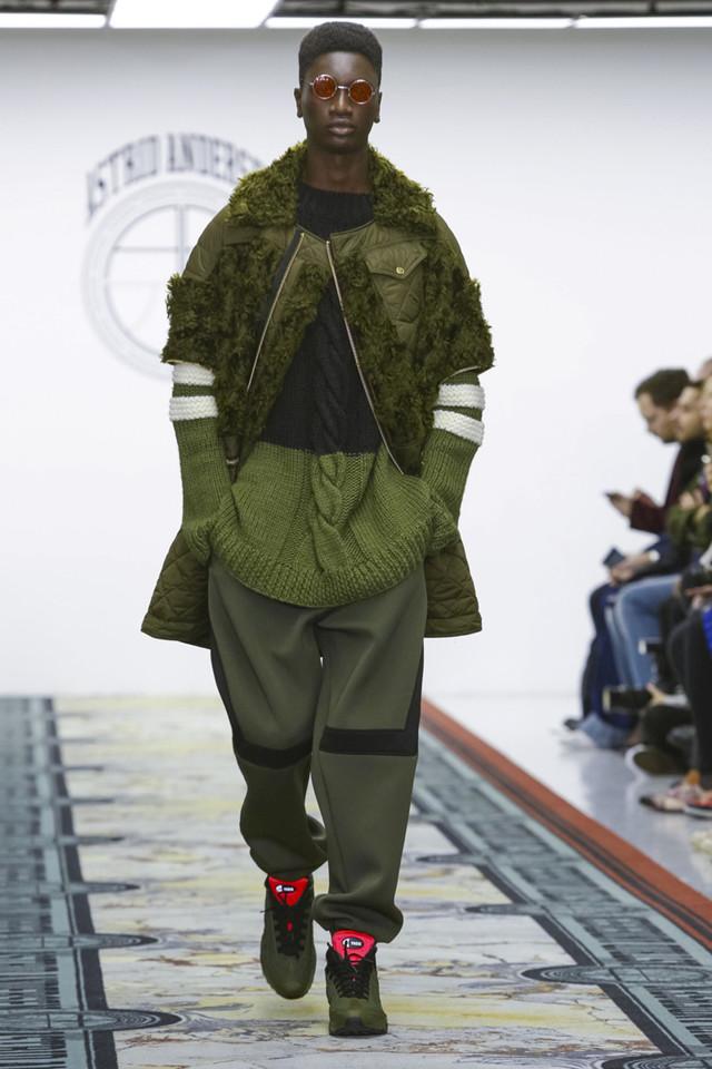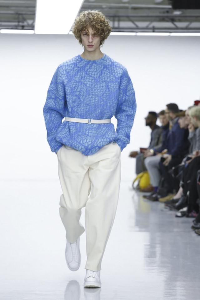 Lou Dalton在Jim Stanton 和Horse Meat Disco的音乐下,将观众带到了她的生长地苏格兰东部的Shetland群岛。设计师参考当地地域文化和渔民着装,结合肩线掉落的设计将功能性服装以悠闲的轮廓重现,极厚的毛绒卫衣和长裤是这场秀的一大记忆点。Lou Dalton 本季与英国皇家针织品牌John Smedley合作制作了一系列手工编制的轻美利奴羊毛卫衣,以数码印花的方式将灵感图像印染,舒适而时髦。Lou Dalton本季还和鞋履品牌Grenson合作推出了两双皮靴,其中黑色款的鞋头有金色挡片的设计,在搭配中能轻易成为全身造型里的一大亮点 。