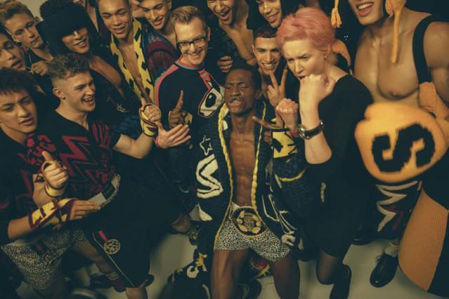 Grace Jones的影响则体现在该系列的用色上。这位前卫Disco女王超于常人的健美身材与大胆的妆容在Sibling的新一季的系列中都有所体现。虽说这是秋冬系列,模特可没有羞于展露壮硕的身材。而黑人模特的脸上,也被涂上了前卫歌手式的复古概念化金色眼影。