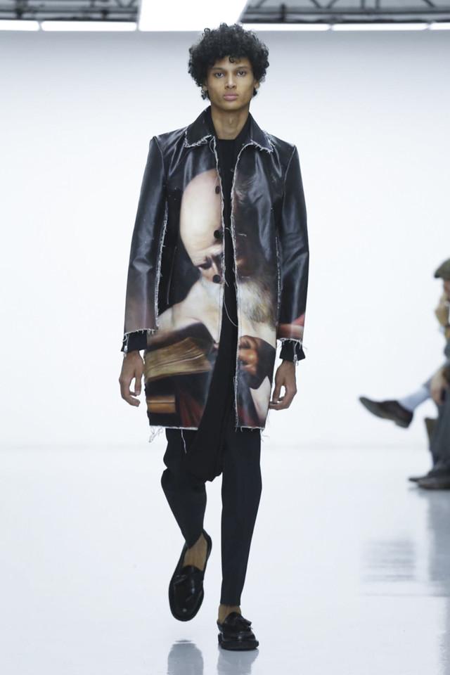 乍看之下,这个系列暗沉而正式。若撇开他那一层外表,这个系列其实颇为“自命不凡”。他将具有悲剧色彩的意大利画家Caravaggio(卡拉瓦乔)所描绘的圣经故事“David and Goliath”的场景印帆布上,然后将此制作成大衣。