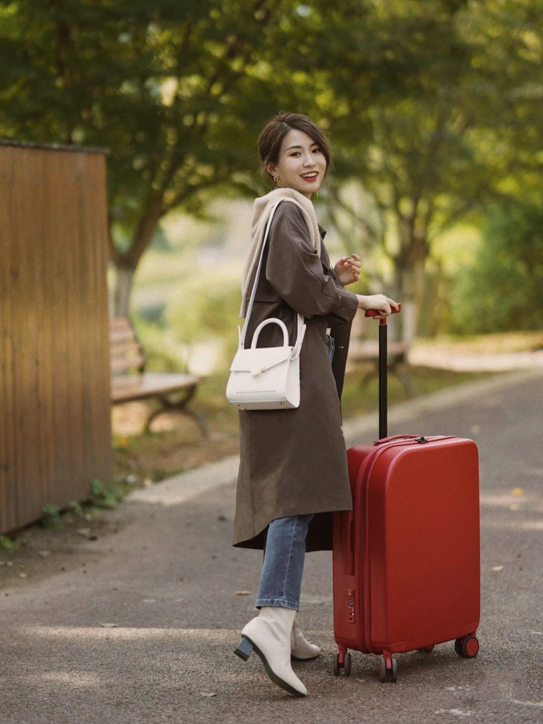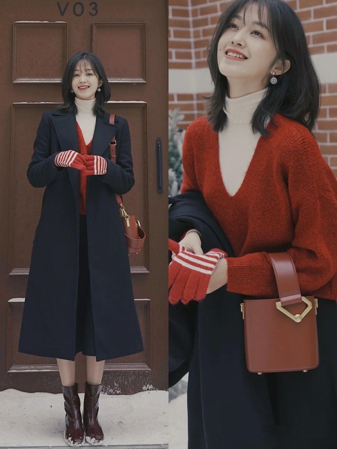 还有小面积的亮色也同样能点亮全身,例如一件红色的毛衣作为内搭,即便大衣是黑色的款式,也依然不会显得太沉闷,红色穿在上半身,也能更好的衬托脸部的肤色,显白又显气质。