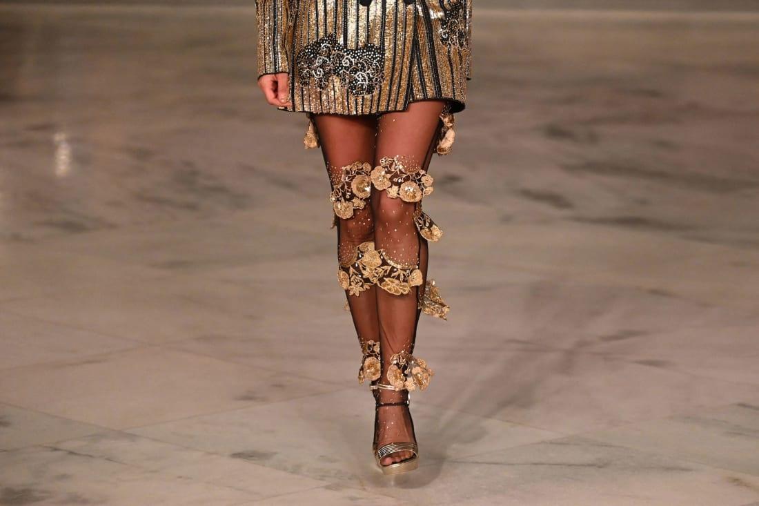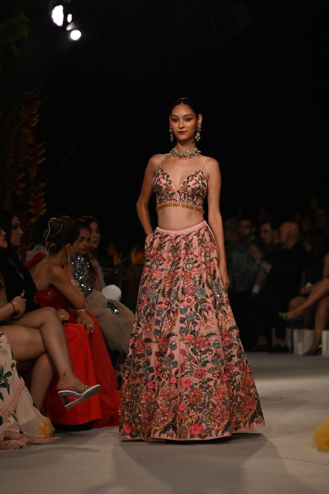 秀场上的许多晚装造型融合了印度和西方风格,例如 Varun Bahl 的带有花卉刺绣贴花作品的垂褶连衣裙和 Rahul Mishra 的黑色和金色垂褶西装套装。House of Valaya 创始人 JJ Valaya 将黑色和象牙色雪佛龙纱丽搭配天鹅绒刺绣夹克,而品牌 Falguni Shane Peacock 的 lehengas 则具有舞会的感觉。以新时代廓形而闻名的 Amit Aggarwal 用他的 3D 裙子和重新设计的 dupattas 解构了 lehenga。