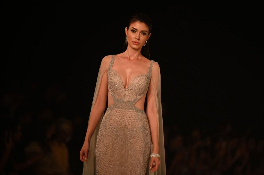 2022 年 7 月 30 日,在新德里举行的 FDCI 印度时装周期间,一位模特展示了设计师 Amit Aggarwal 的作品。
