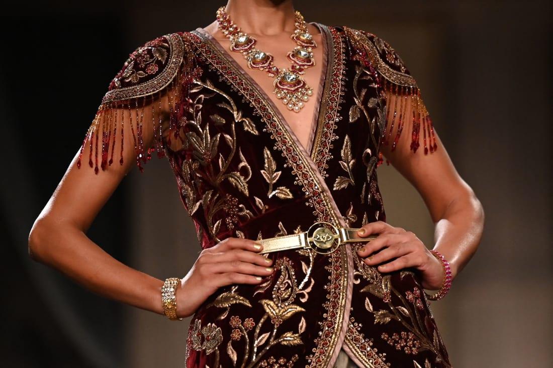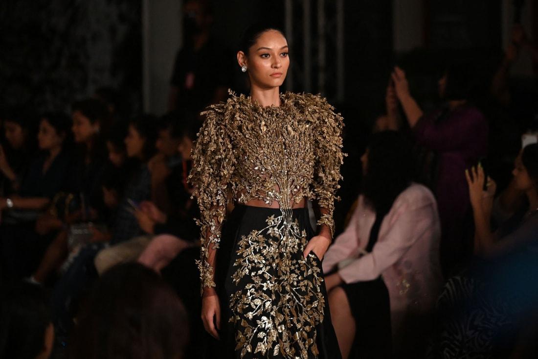 顶部图片说明: 2022 年 7 月 22 日在新德里举行的 FDCI 印度时装周期间,一名模特展示了设计师 Tarun Tahiliani 的作品。