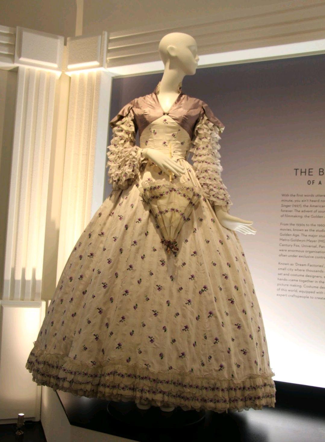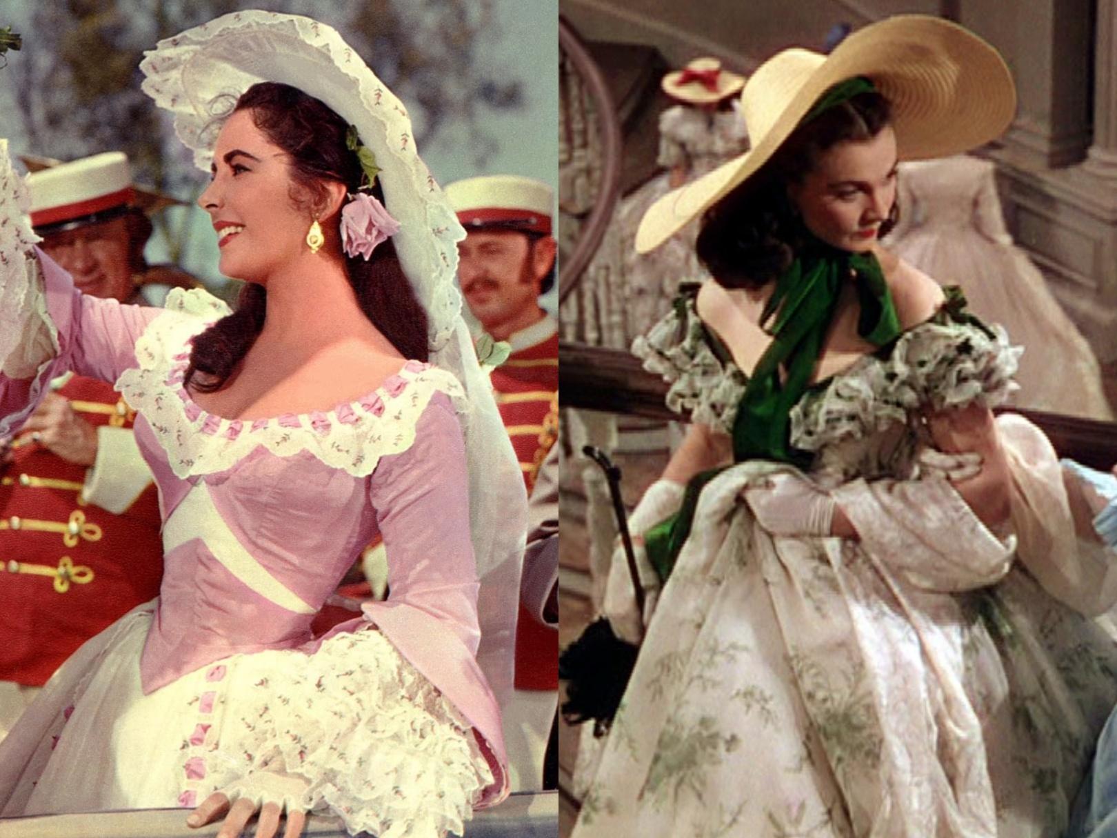 很多人认为这条裙子可以对标费雯丽在《乱世佳人》中穿的树枝纹印花野餐裙。这件粉红色和白色相间的裙子配有配套的遮阳伞和大帽子。
