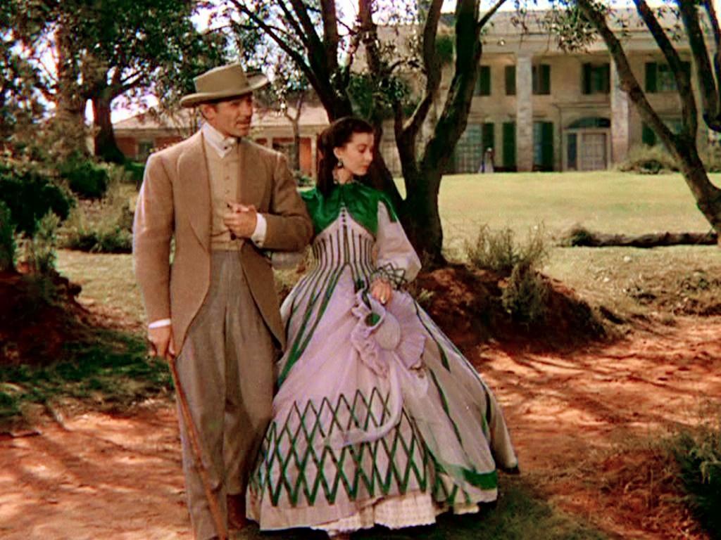 我觉得这件裙子可以对标《乱世佳人》里费雯丽饰演的斯嘉丽和瑞德婚后返回塔拉庄园的绿白双色裙子。