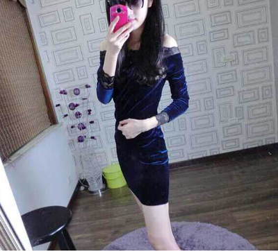 性感露肩一字领、名媛蕾丝金丝绒长袖、包臀修身夜店长裙显瘦连衣裙。