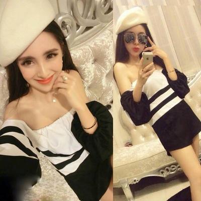 欧美时尚黑白条纹泡泡袖,一字领性感露肩灯笼长袖上衣连衣裙。