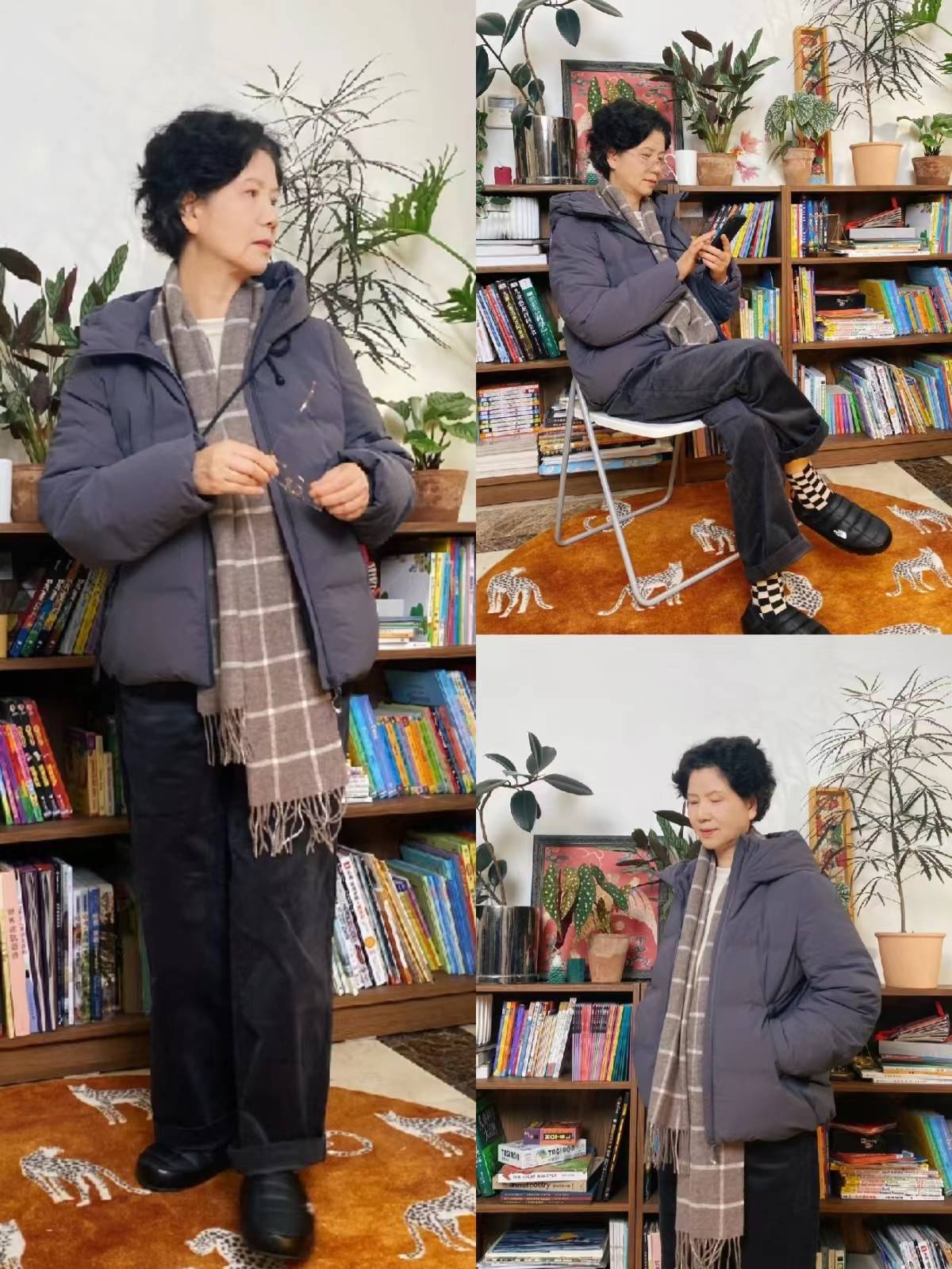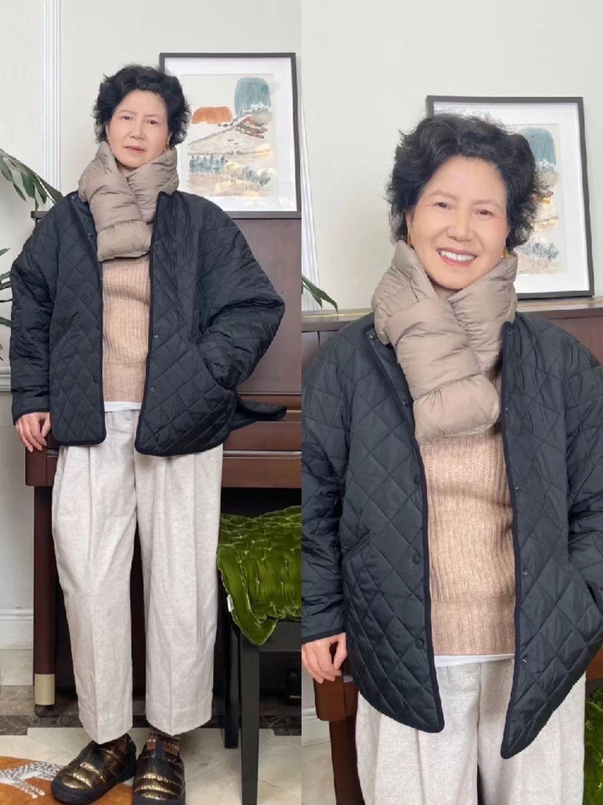 女人过了60岁,并不是说穿各种大红大绿或者设计复杂的单品才叫时尚,恰恰相反,能够衬托出大龄女人自身气质的往往是基础款。在冬季除了格纹大衣,各种采用绗缝设计的奶奶棉服在小苏阿姨的穿搭中也很常见。