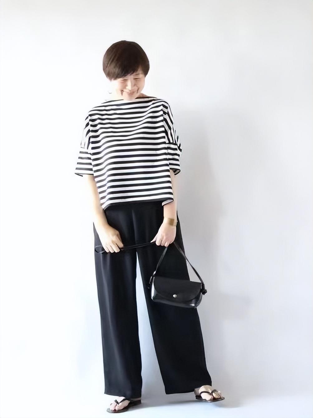 条纹衫是日本大龄女人衣橱里的重要单品,比如黑白条纹衫、蓝白条纹衫,这些条纹衫舒适日常又随意,大家还能根据身材选择相对应的版型。