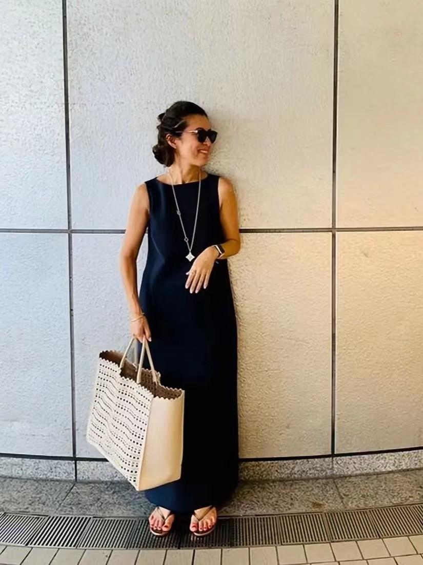 上了年纪的日本女人很少穿连衣短裙,基本上都是用连衣长裙凹造型,而且长裙的剪裁简约、线条干净,采用单一颜色。