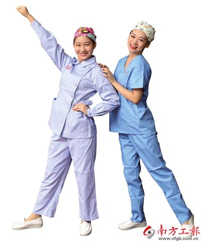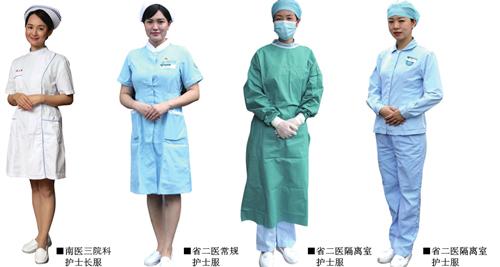 南医三院血液净化中心灰蓝色护士服(左)、消毒供应中心蓝色护士服