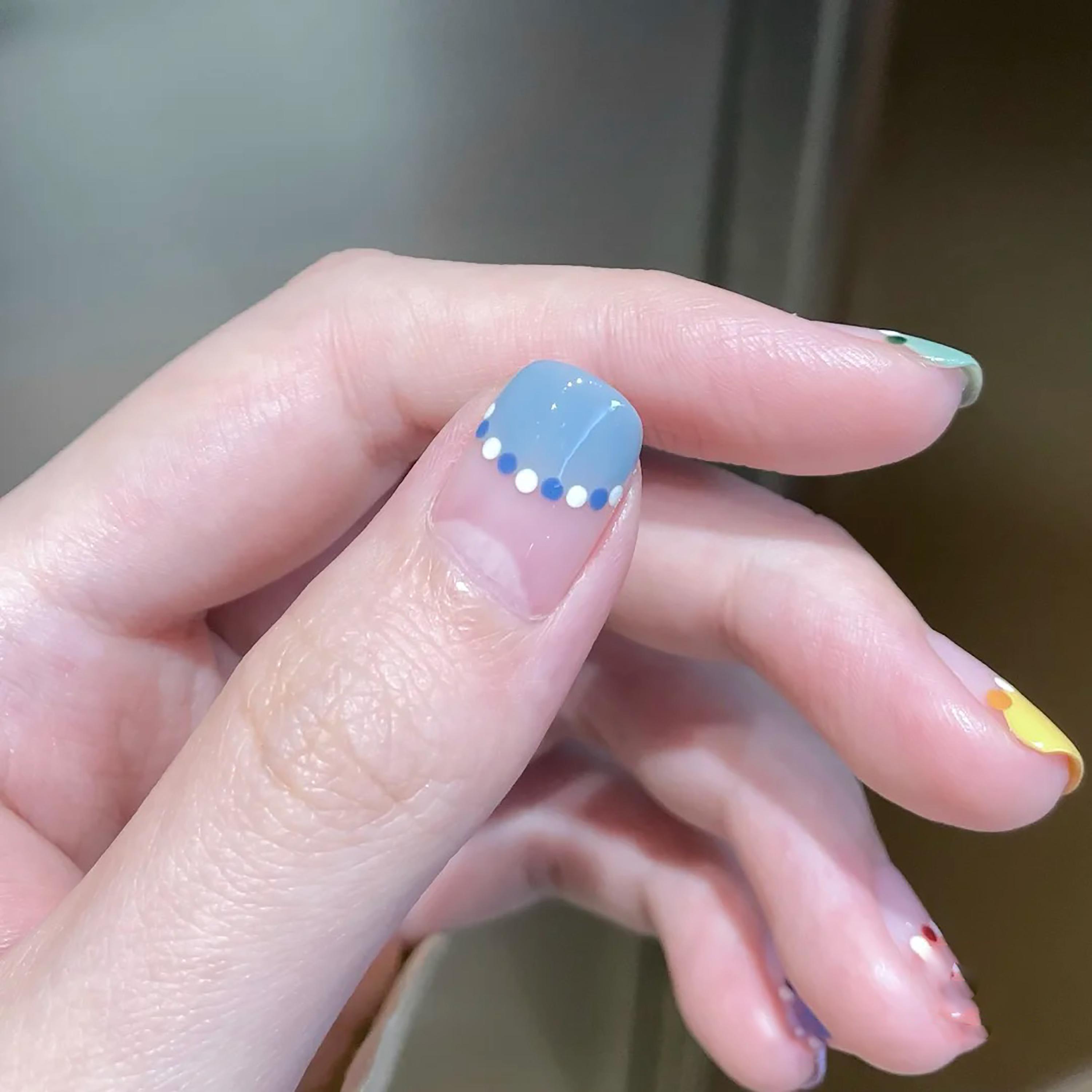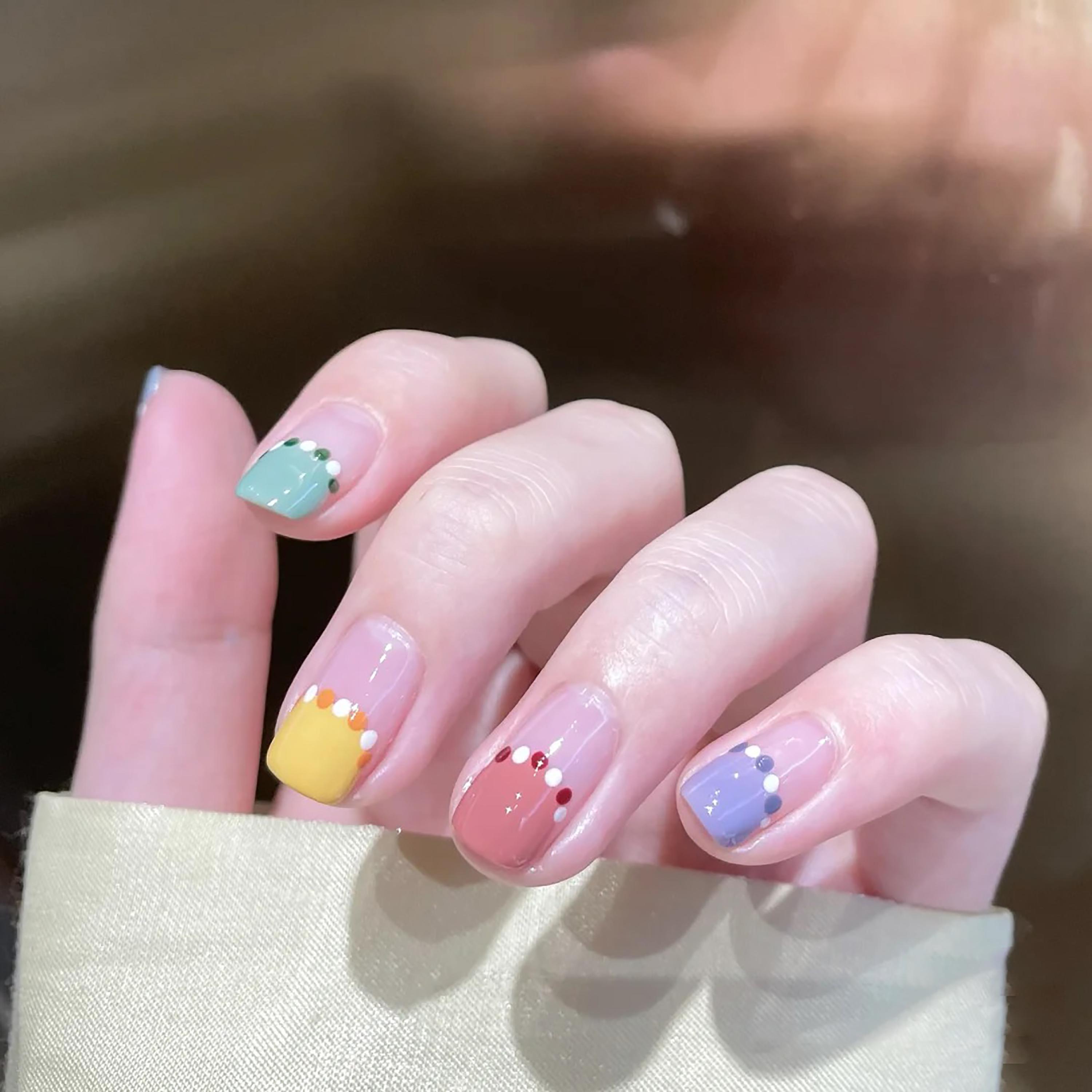花里胡哨的美甲在夏季也会有一种鬼马精灵的感觉,不知道为什么看到这种甜美俏皮的配色就会联想到鬼鬼,可爱又搞怪的小女生的的氛围。