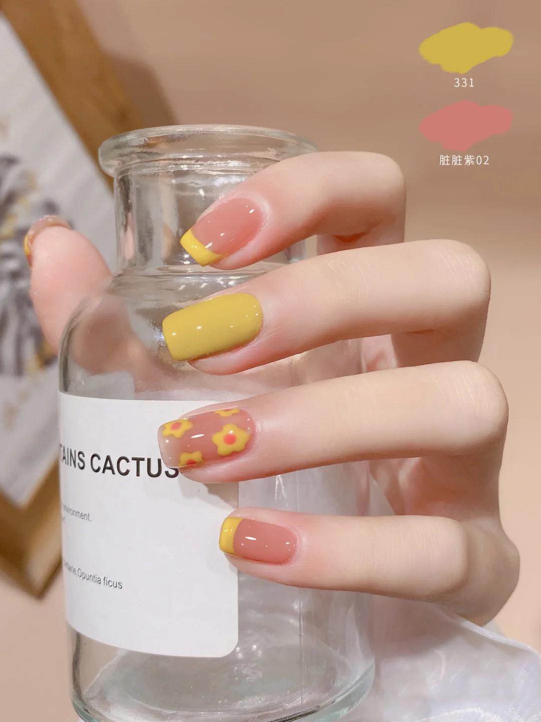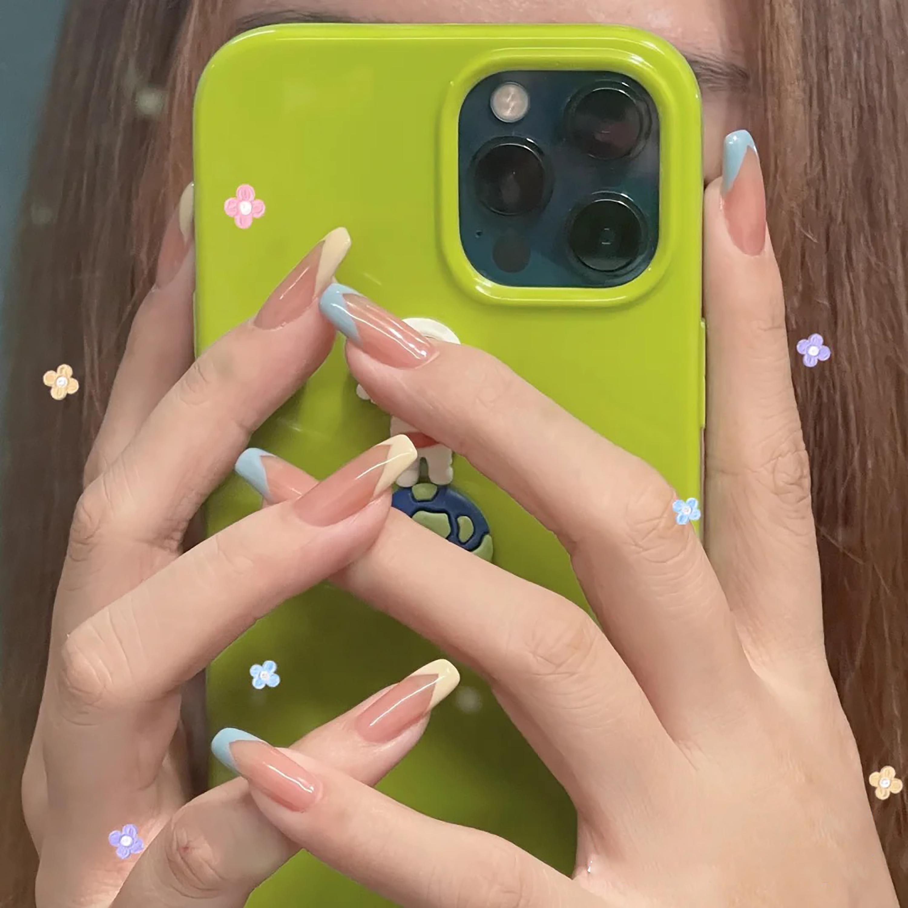 像这种方形甲就很合适童趣的花样和配色,满满的夏日感,简单又显白好看,在家自己都可以做。
