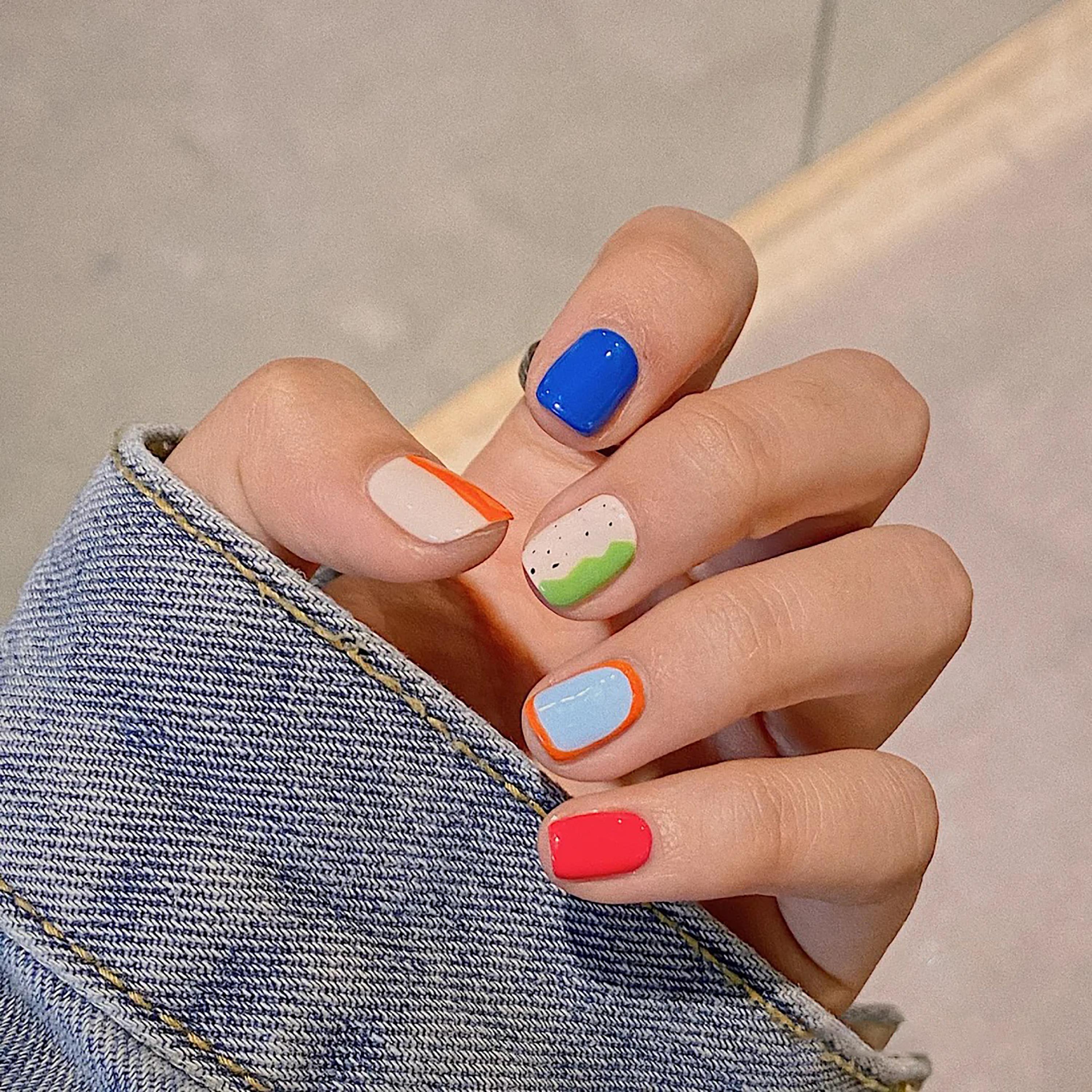当然下夏季如果想要色彩更多些的话,也可以采用撞色的颜色搭配,克莱茵蓝和橘色的搭配,仿佛指尖都散发着橘子味的海风,让你置身于橘子洲里。