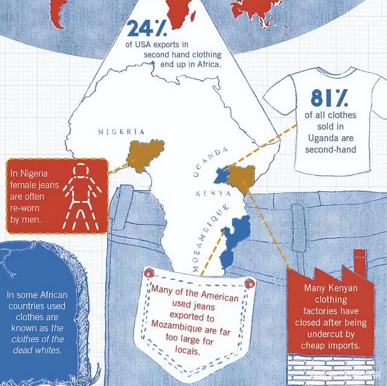东非共同体为了缓解这种局势做出许多的计划,但后都以失败告终,因为如果禁止二手衣服进入非洲市场,那就直接影响了非洲的GDP,在税收上,当地政府也会减少将近2亿多的收入,这就没有办法做到互利互赢的局面。