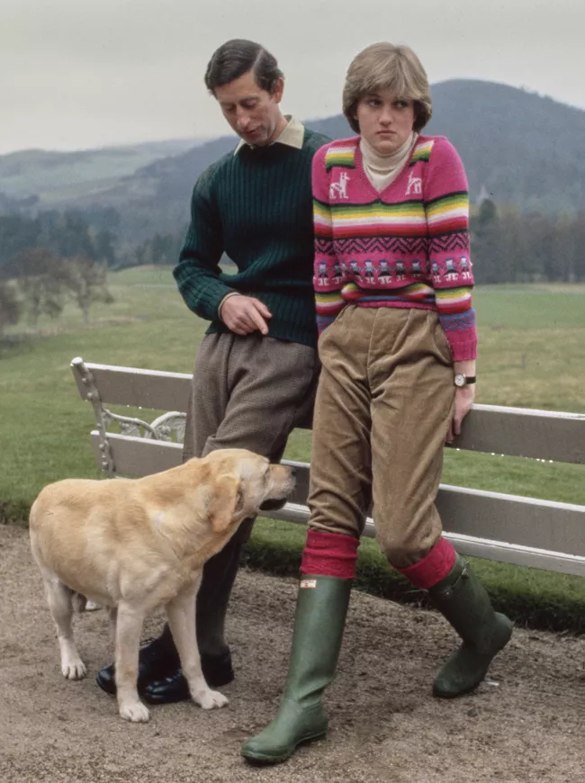 戴安娜和查尔斯订婚后第一次正式合影时,戴安娜也穿了一件可爱的粉色毛衣,搭配灯芯绒裤子和她喜欢的雨靴。
