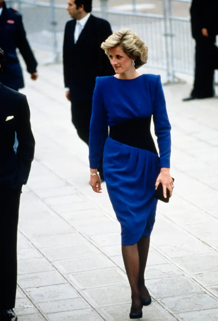80年代拼色撞色刚刚流行,戴安娜在1985年去威尼斯旅行时的蓝黑色连衣裙也紧跟时尚。腰部深色的设计让身材更有曲线。
