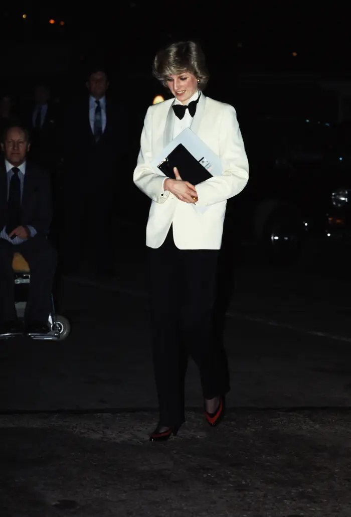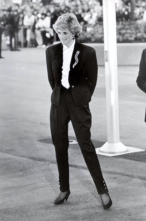 在此之前女性穿裤装会被人为是不正规的,无法进入一些高端场合。而戴安娜早在80年代,就穿着全男装礼服出席活动了。