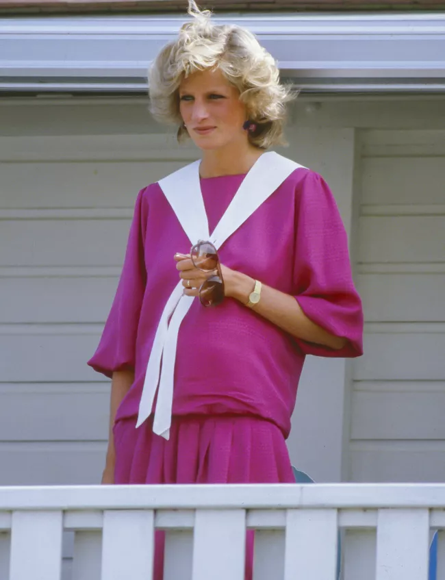 1984 年戴安娜怀着7个月的哈里王子,用一件洋红色的水手领套裙作为孕妇装,观赏了马球比赛,在舒适的同时仍然显得活泼年轻。