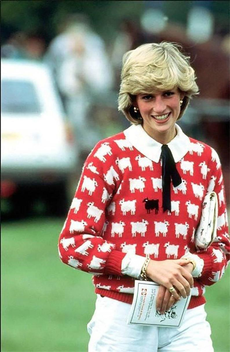 戴安娜的毛衣在当年造成了多次断货潮流。知名的是这款1980年看马球比赛时穿的毛衣。上面有一只小小的黑羊在一群白色绵羊中。