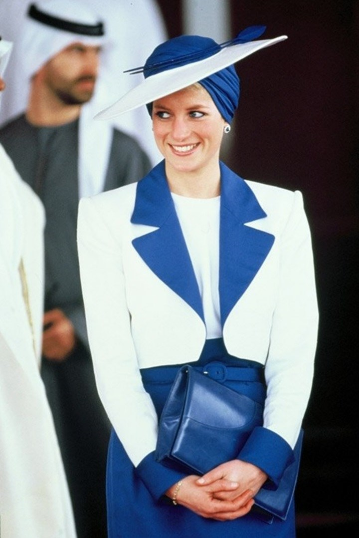 戴安娜在迪拜出访的穿搭也十分惊艳。全身大面积的蓝色色块干净大气,而她没有戴常规的礼帽,而是将礼帽和头巾结合起来,致敬当地文化。