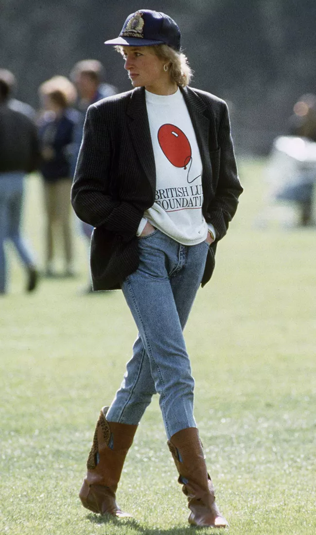 戴妃身上也能发现不少牛仔元素。她与小时候的威廉一起看马球比赛时,穿着一件牛仔背带裤,简单但足够好看。