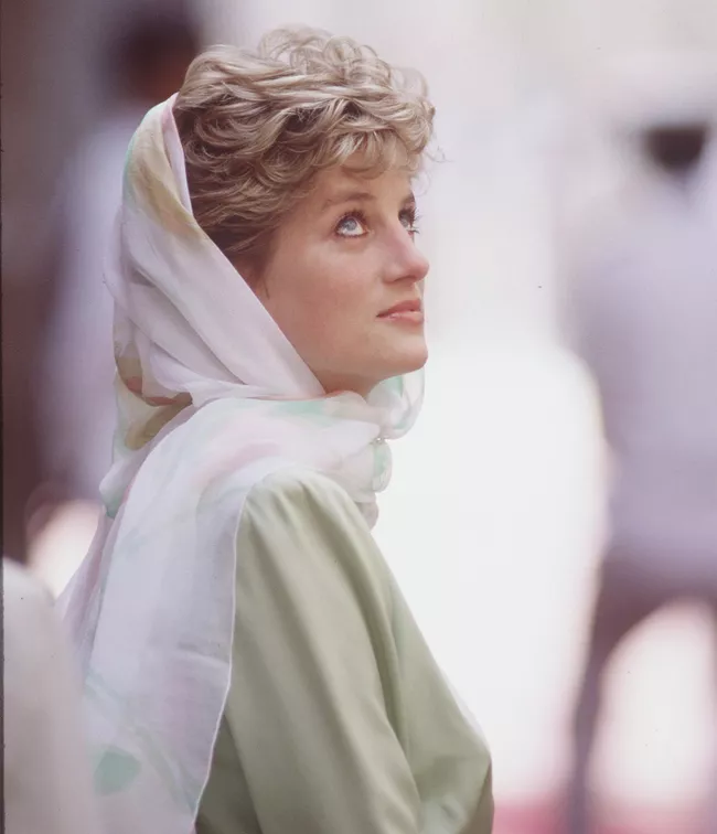 戴安娜1992年的埃及行,穿搭成功。先是一套简洁的绿色连衣裙,配上柔软的白色头巾,凸显了纯洁清澈的气质。