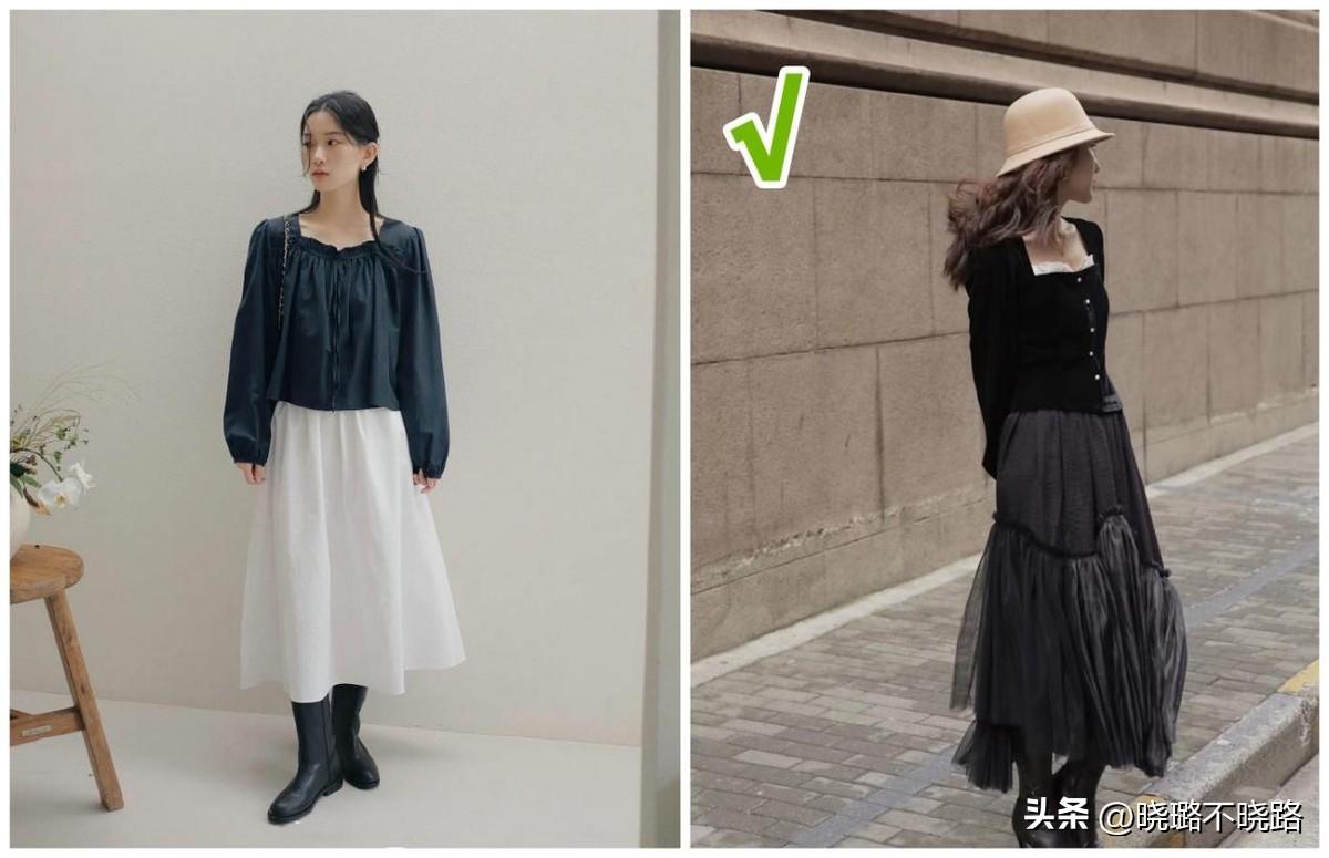 有时候完善细节也需要从整体出发,这个整体就是衣服的搭配度,这两套都试试同样的挤奶衫+A字裙+靴子的搭配,但是右边这套显高显瘦的果就会更好一点,为什么呢?