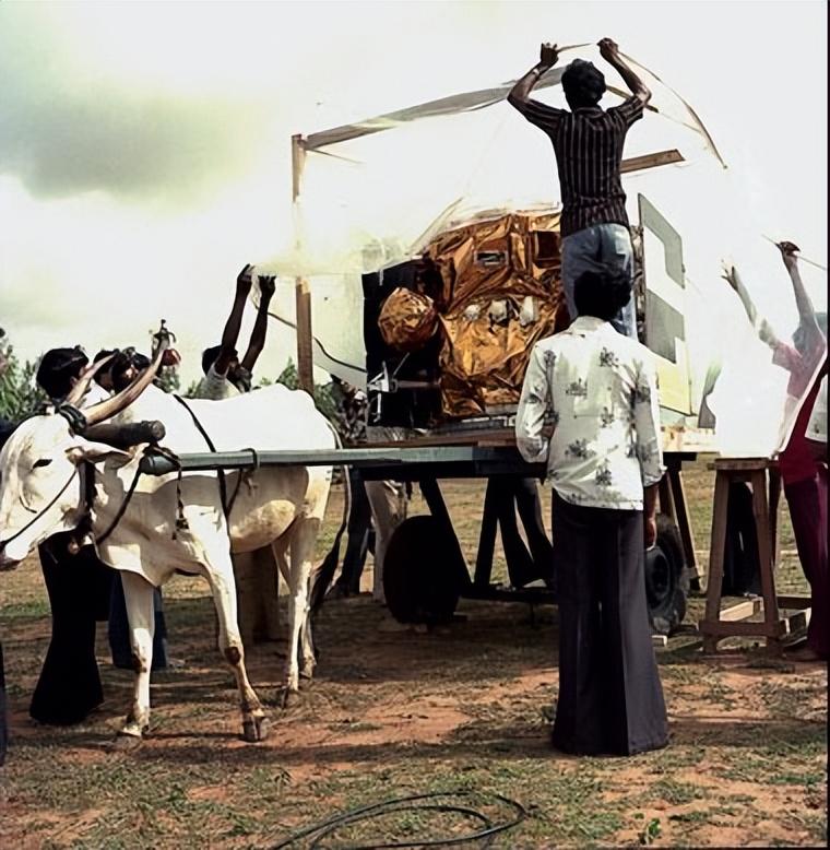 1981年,印度用牛车运输的第一颗卫星“苹果”。