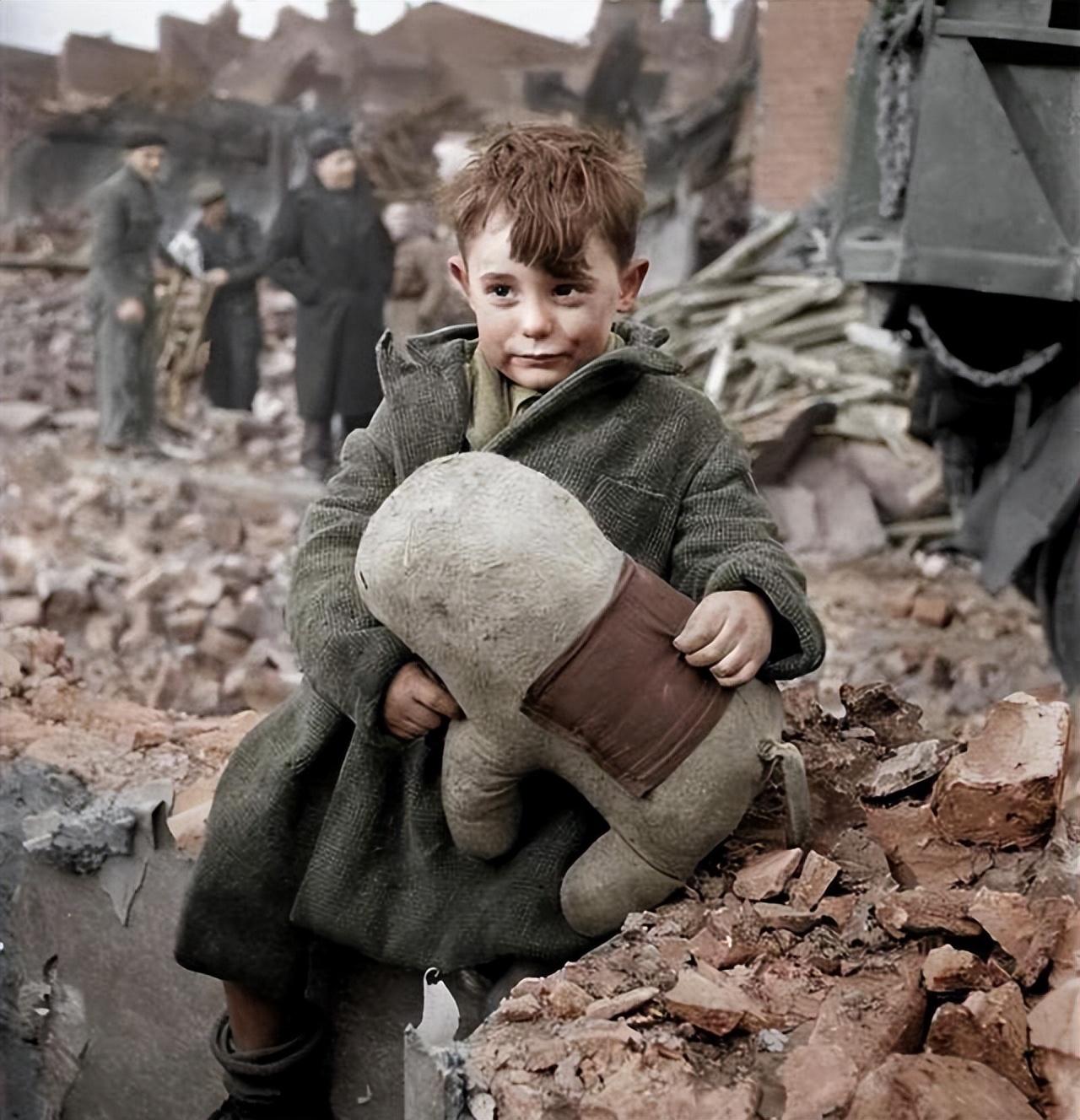 1945年,经历轰炸后的伦敦一个男孩抱着他的同伴:一个毛绒玩具动物。