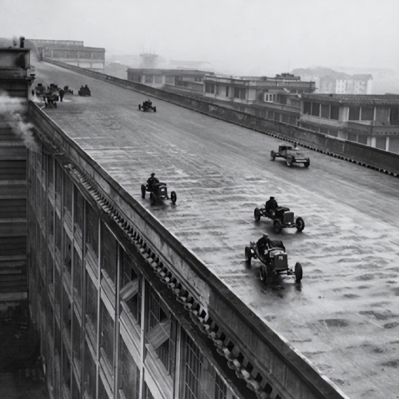 1923年,工厂工人在意大利都灵菲亚特工厂的屋顶上享受比赛,那里的楼顶也做跑道使用。