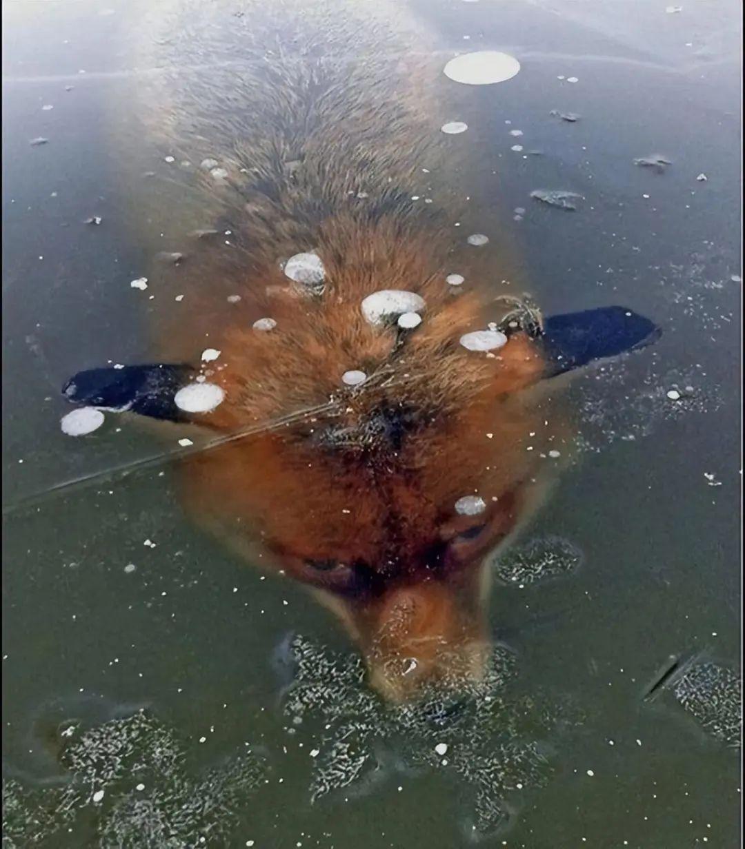 一只不幸的狐狸,不慎失足掉落了水中,极寒天气让它变成了一尊冰雕。