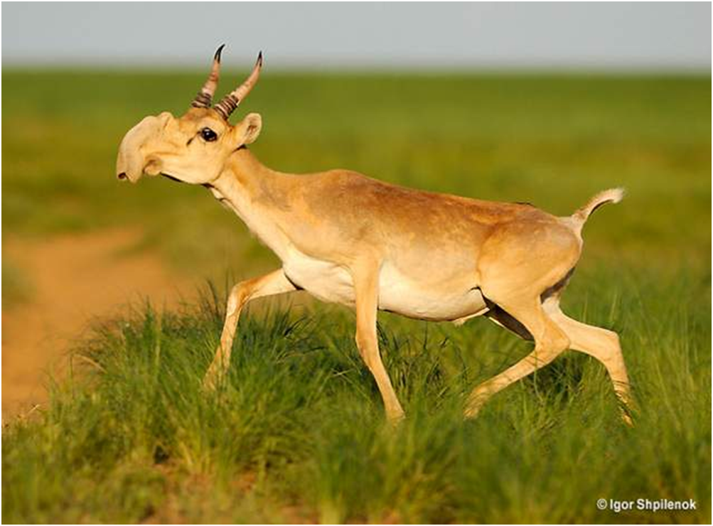 赛加羚羊以其独特的大鼻子而闻名,它可以弯曲和膨胀,以帮助它在哈萨克斯坦尘土飞扬的夏天和严酷的冬天更好地呼吸。