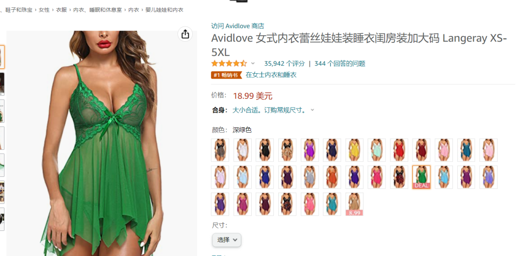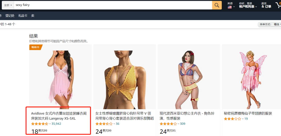 在亚马逊前台搜索“sexy fairy”,排在第一位的赫然就是 TikTok 同款,名为 Avidlove 女式内衣蕾丝娃娃装睡衣。