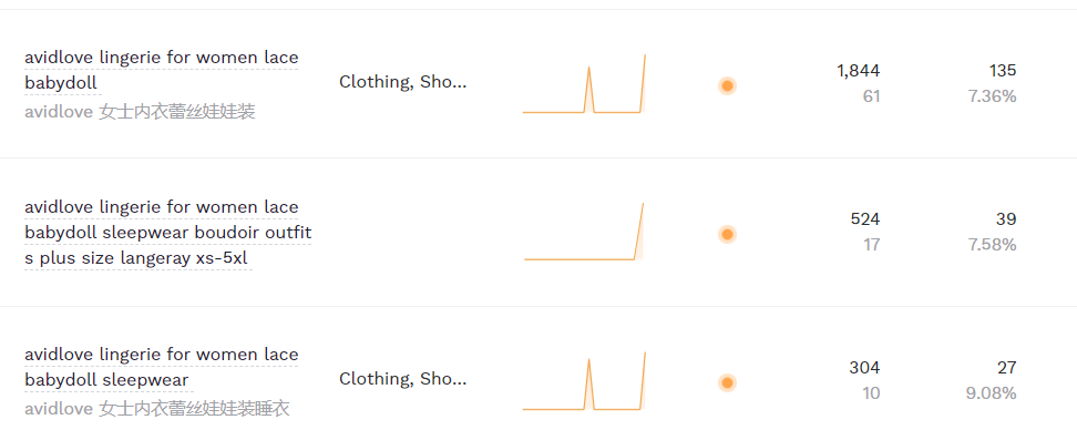 目前, Avidlove 的一个长尾关键词组“女士内衣蕾丝娃娃装睡衣”在亚马逊的搜索指数处于迅猛上升状态,据第三方数据查询得知,月搜索量已达 1844 ,购买量约 135 件。
