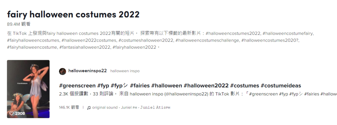 而在今年,TikTok 上话题标签 #fairy halloween costumes 2022 的总浏览量也达到了 8940万。