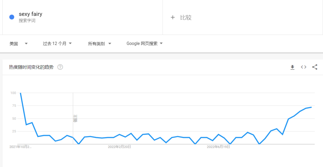 在过去的十二个月中,美国消费者在谷歌上搜索 “sexy fairy”的趋势呈现出一个 U 型的热度图形,其中热度高的时期在去年 10 月份左右,目前又走出的上升态势。