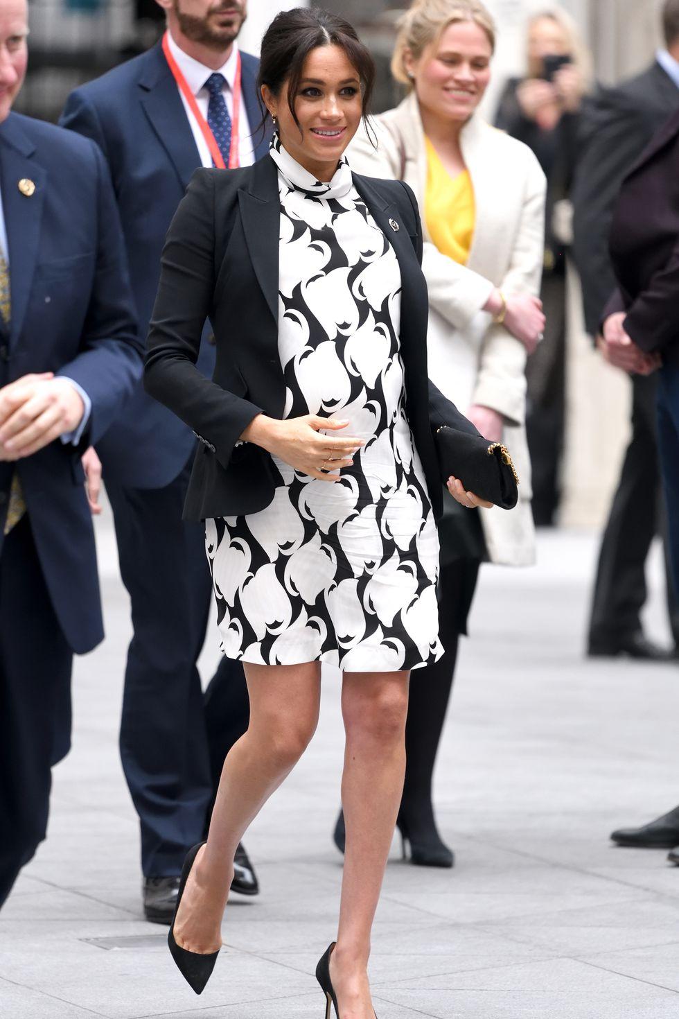 look3:Reiss印花连衣裙2019年3月8日,梅根出席了由女王英联邦信托基金召集的国际妇女节专题讨论会。她穿了一件Reiss印花连衣裙、马诺洛•伯拉尼克(Manolo Blahnik)高跟鞋和一件亚历山大•麦昆(Alexander McQueen)黑色运动西装。再搭配一个(Stella McCartney)的斜挎包。