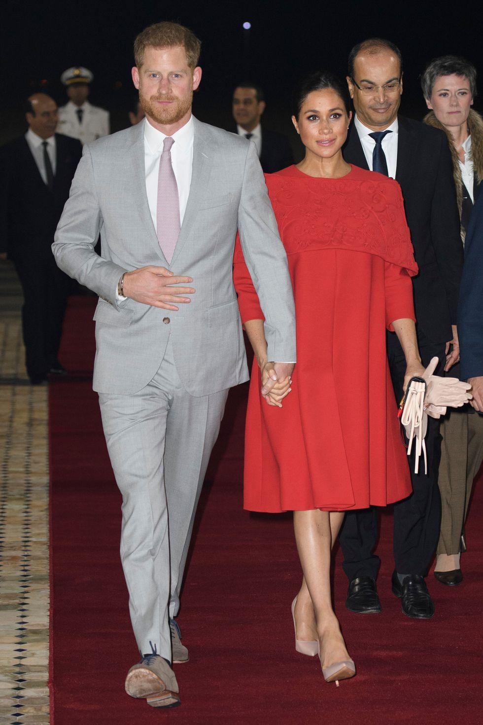 look9:华伦天奴定制红色礼服2019年2月23日,这对夫妇抵达摩洛哥卡萨布兰卡机场,开始他们的皇室之旅。苏塞克斯公爵夫人梅根身着华伦天奴定制红色礼服搭配裸色高跟鞋,优雅又大方,而华伦天奴的驼色斜挎包让造型更加协调。